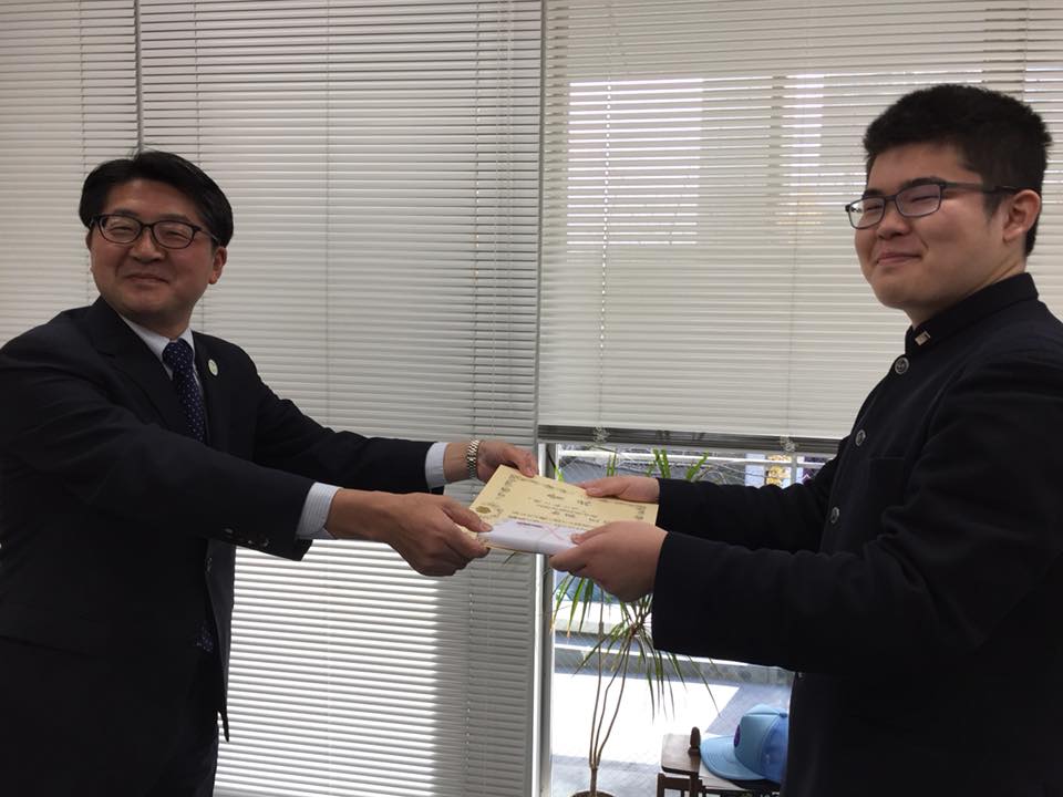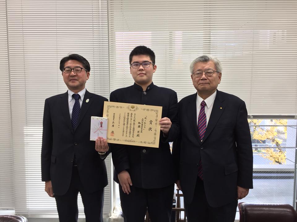 トピックス 2017/12/07 「税に関する高校生の作文」で優秀作品に選出されました 「税と私たち」というテーマで3年生の加藤匠君が書いた作品が平成29年度“税に関する高校生の作文”優秀作品に選出されました。 本日、神田税務署長 兵庫 浩様から表彰されました。加藤君、おめでとうございます。
