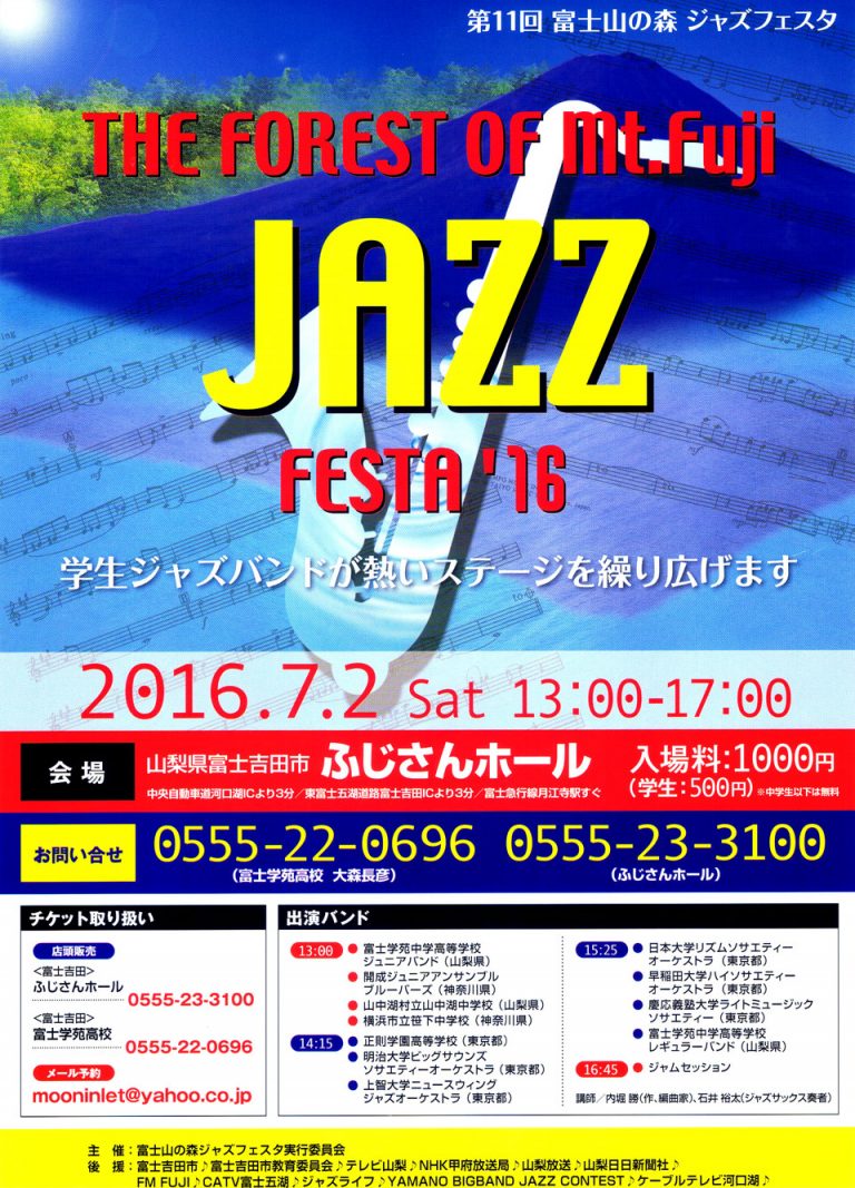 トピックス 2016/06/27 ビッグバンド部が富士山の森ジャズフェスタに出演します 7月2日(土)に富士吉田市にあるふじさんホールにて開催される「第11回富士山の森ジャズフェスタ」に本学園のビッグバンド部が出演することが決まりました。 日時:平成28年7月2日(土)12時30分開場 13時開演 17時終演 場所:ふじさんホール(富士吉田市) 主催:富士山の森ジャズフェスタ実行委員会 入場料:一般1000円 大学生・高校生500円 中学生以下は無料 関東選抜の学生ジャズバンド(小・中・高・大)による演奏及び講師による演奏 詳しくは、下のバナーをご覧下さい。