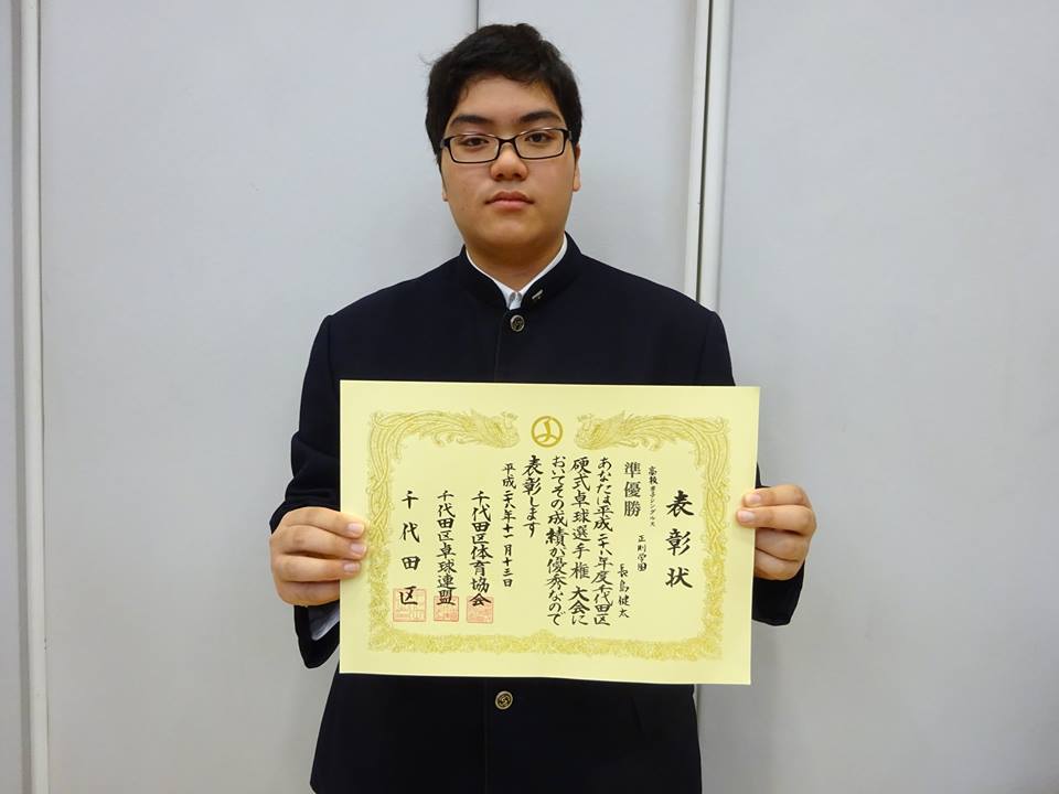 11月13日(日)に平成28年度千代田区硬式卓球選手権大会が行われ、長嶋健太君(2年)が準優勝しました。