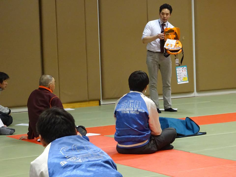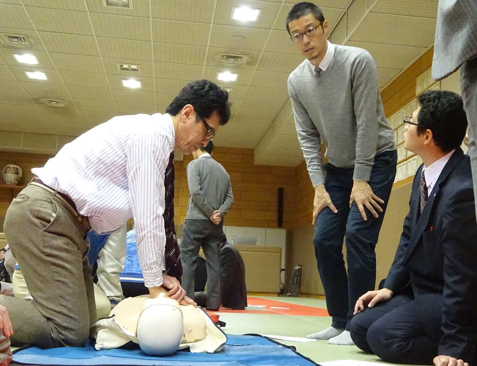 人形を用いた胸骨圧迫(心臓マッサージ)、AED(自動体外式除細動器)の使用方法などの一次救命処置についての講習をしていただきました。