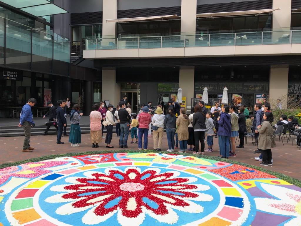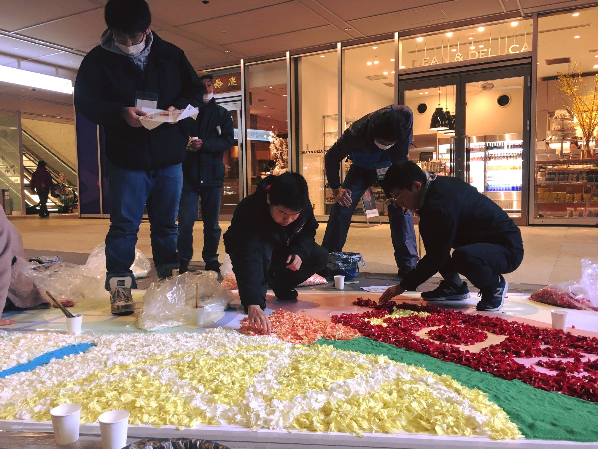 色とりどりの花びらを用いて花絵の制作を進めましたが、あいにくの天気になってしまい仕上げは22日(木)へと引き続きとなってしまいました。