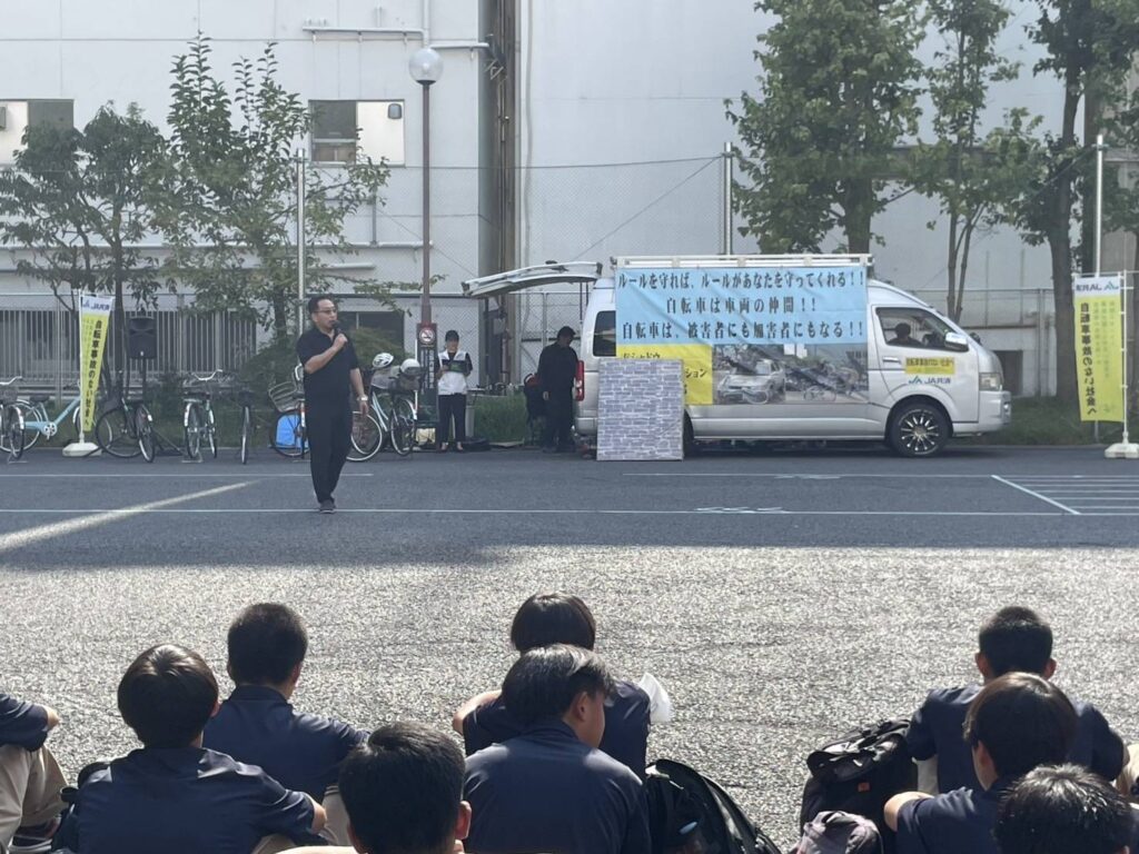 最寄の公園広場へ移動し、シャドウ・スタントプロダクションの皆さまのご協力のもと、スタントマンによる自転車事故の再現を見ながら、いかに安全に自転車を走行することが大切かを学んだ大変有意義な時間でした。