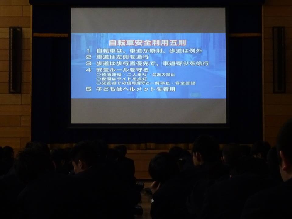トピックス 2017/11/15 第2回交通安全教室を実施しました 1年生対象に第2回交通安全教室が実施されました。 映像を用いた自転車の正しい乗り方の安全指導を始め実際に発生した事例について神田警察署の交通課の署員の方にお越しいただいてお話をしていただきました。 生徒達は今回学んだ安全意識を持って日頃より生活をしてもらいたいと思います。神田警察署の皆様、本日はありがとうございました。
