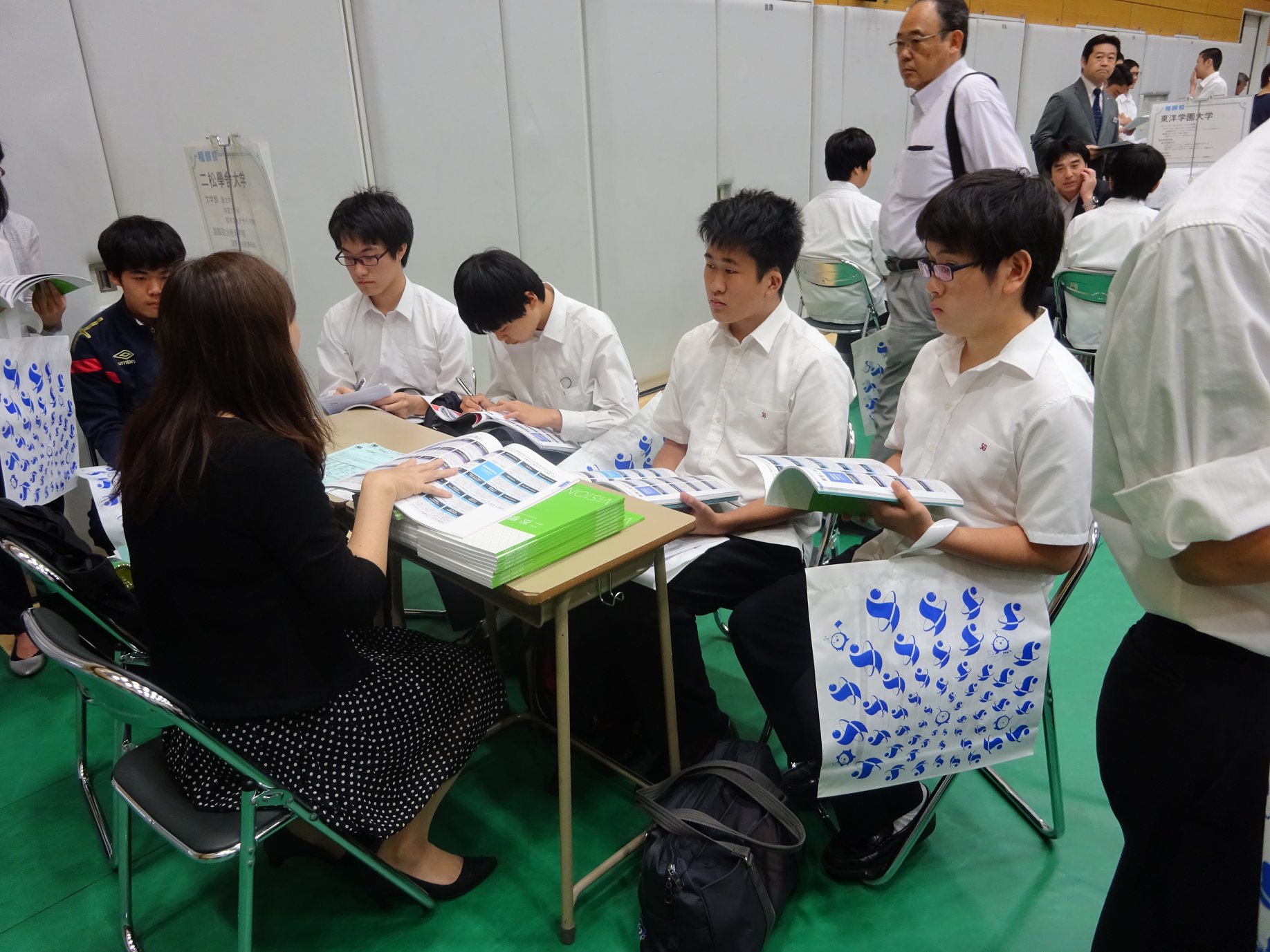 トピックス 2018/06/18 第2回校内大学入試説明会を実施しました 6月13日(水)13時より7階体育館にて第2回校内大学入試説明会が開催されました。 個別ブースで実施された入試説明会には33大学に参加いただき3年生、保護者に対応いただきました。 3年生はこれらの説明会を通じて希望進路の実面に繋げていってもらいたいと思います。 参加いただいた大学関係者の皆さまありがとうございました。
