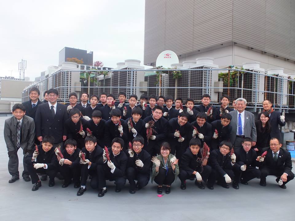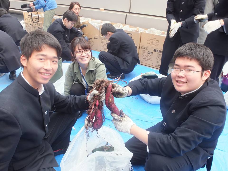 参加した2年A組の生徒達は、都心のオフィスビルの屋上室外機置場で行われているサツマイモ栽培に驚きながらも大きく育ったサツマイモを楽しみながら収穫していました。