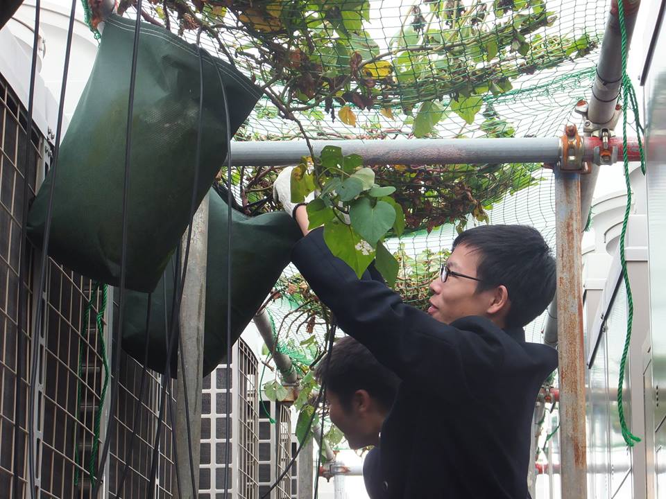 屋上緑化から省エネにつなげることを目的として数年前より室外機置場でサツマイモが栽培され、芋緑化システムによりこの夏には最大10%の電力量の削減へとつなげることができたようです。