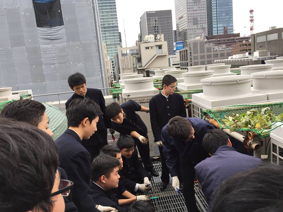 11月16日(水)住友商事美土代ビル屋上で運用されている芋緑化システムの見学とサツマイモの収穫のお手伝いに行ってきました。
