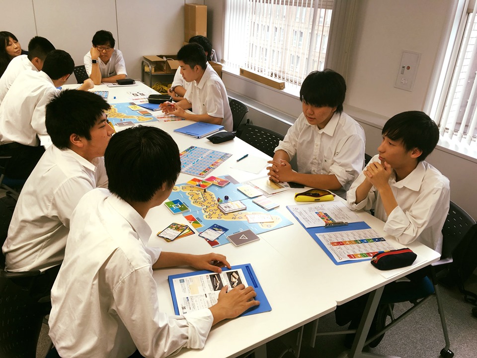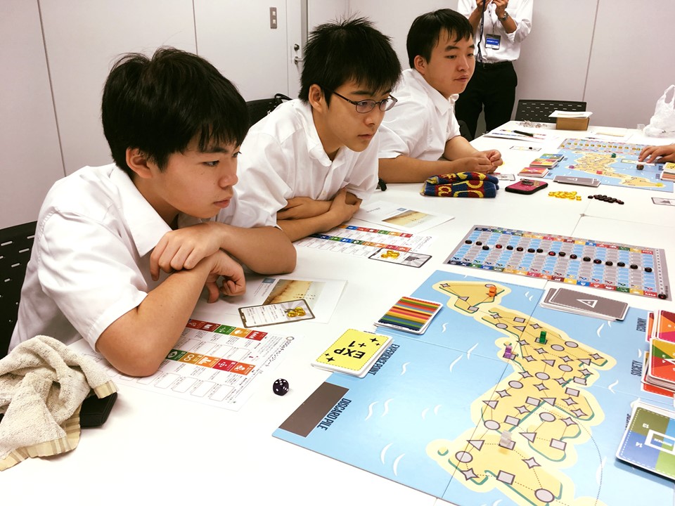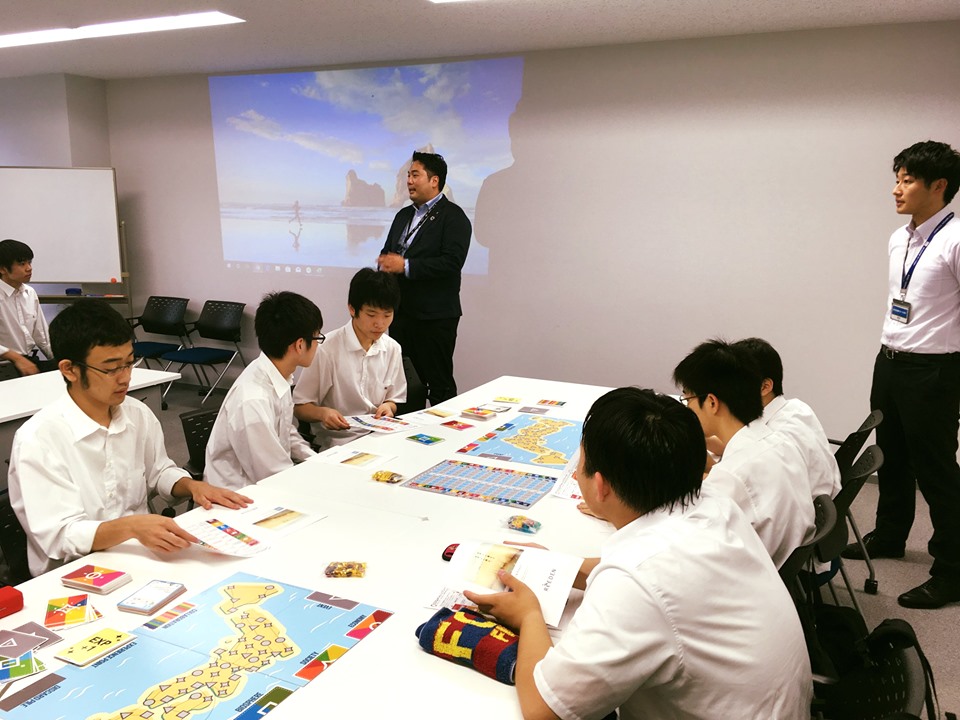 未来技術推進協会半沢様、代表の草場様によるSDGsの講義やオリジナルカードゲームのレクチャー、達成(ゴール)への進め方の話では、生徒達がわかりやすい言葉で考えられるようにスライドを用いて行っていただきました。ゲーム中は、各カードにあるミッションにグループ内でコミュニケーションをとりながら解決していく様子が見られるなど夢中になって取り組んでいる様子が見られました。