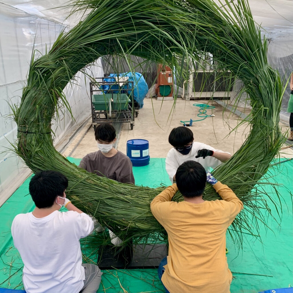 「ちのわ」(茅の輪)とは、穏やかで健やかな生活が送ることができるよう願いを込めながら、カヤやススキなどの植物を刈り取り、大きな輪をつくったものです。古くから日本の暮らしの営みの中では、夏越の祓えとして用いられ、この大きな輪をくぐることにより無病息災を願ってきました。(花いけJAPAN official公式ページより)