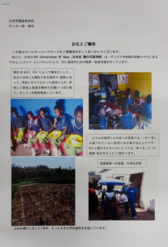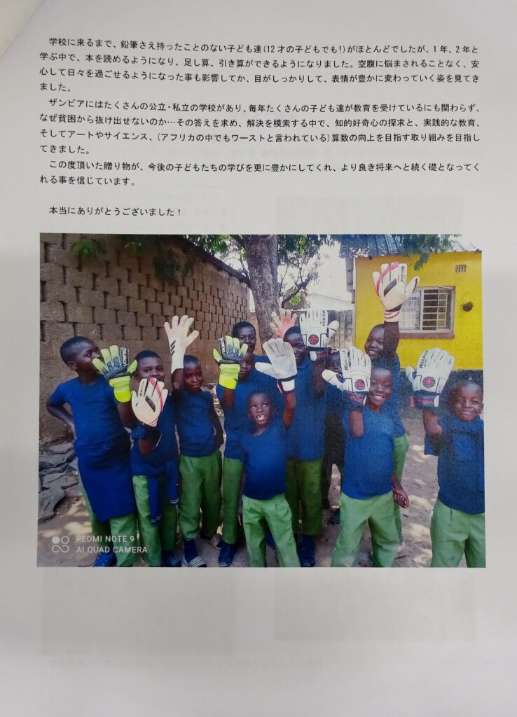 サッカー部では、数年前より独立行政法人国際協力機構(JICA)『世界の笑顔のために』プログラムを通じて発展途上国の子供達へモデルチェンジ前のユニホームや入れ替え後のボールなどの使用していない用品を送る活動を行っています。今年度はキーパーグローブをザンビアの『NGO Cornerstone of Hope』の子供達へ届けることができ、JICAザンビア事務所より子供たちの笑顔溢れるお礼状を送っていただきました。